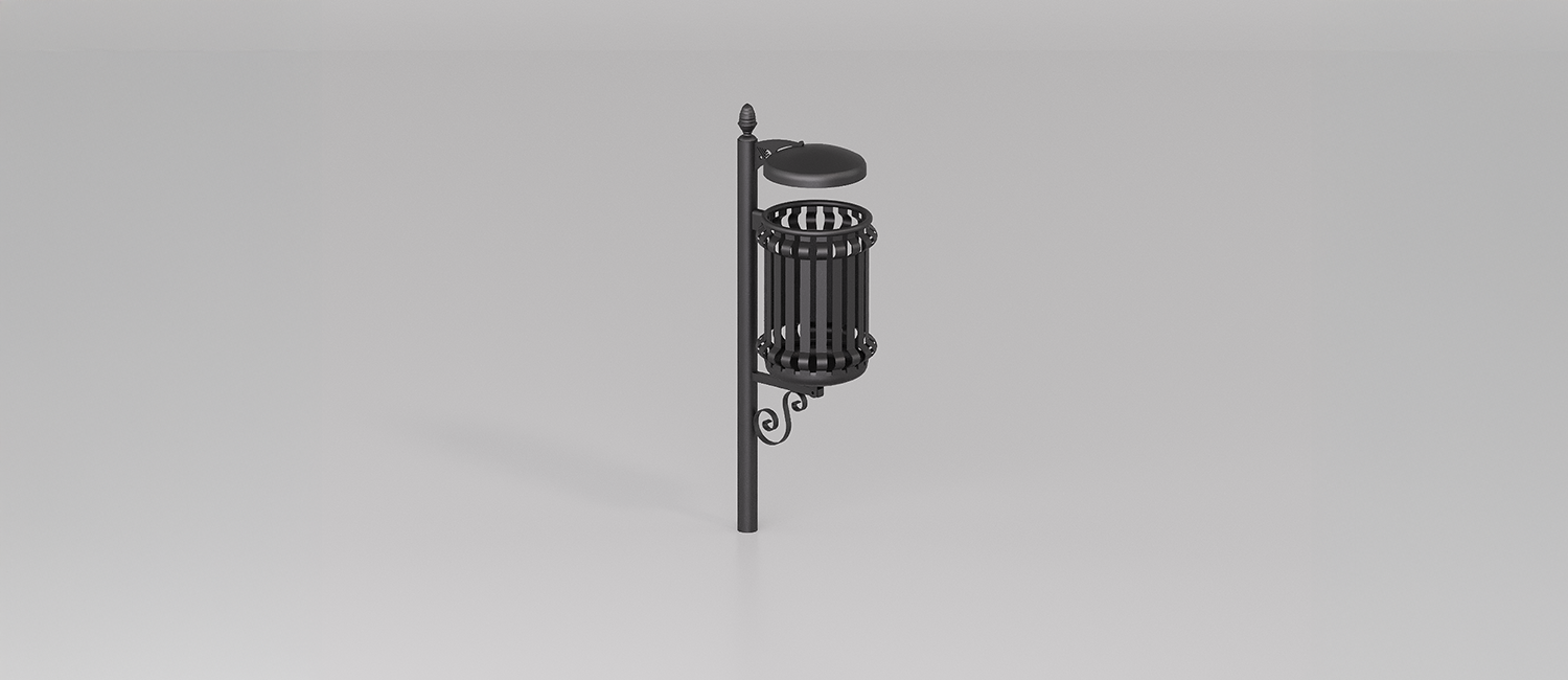 Il Cestino con coperchio è costituito da montante di sostegno in tubo tondo di acciaio zincato adornato nella parte superiore da un fregio decorativo. Coperchio sagomato in lamiera zincata e lunetta di rinforzo, in lamiera zincata, ricavata da taglio plasma ad alta definizione con intaglio decorativo. Braccetto inferiore per il sostegno del cesto con elemento decorativo in acciaio zincato. Cesto di forma cilindrica realizzato con N. 20 profili in acciaio zincato sagomati alle due estremità; parte superiore bordata da tubo tondo zincato e fondo sagomato in lamiera zincata con fori per lo scarico delle acque meteoriche.