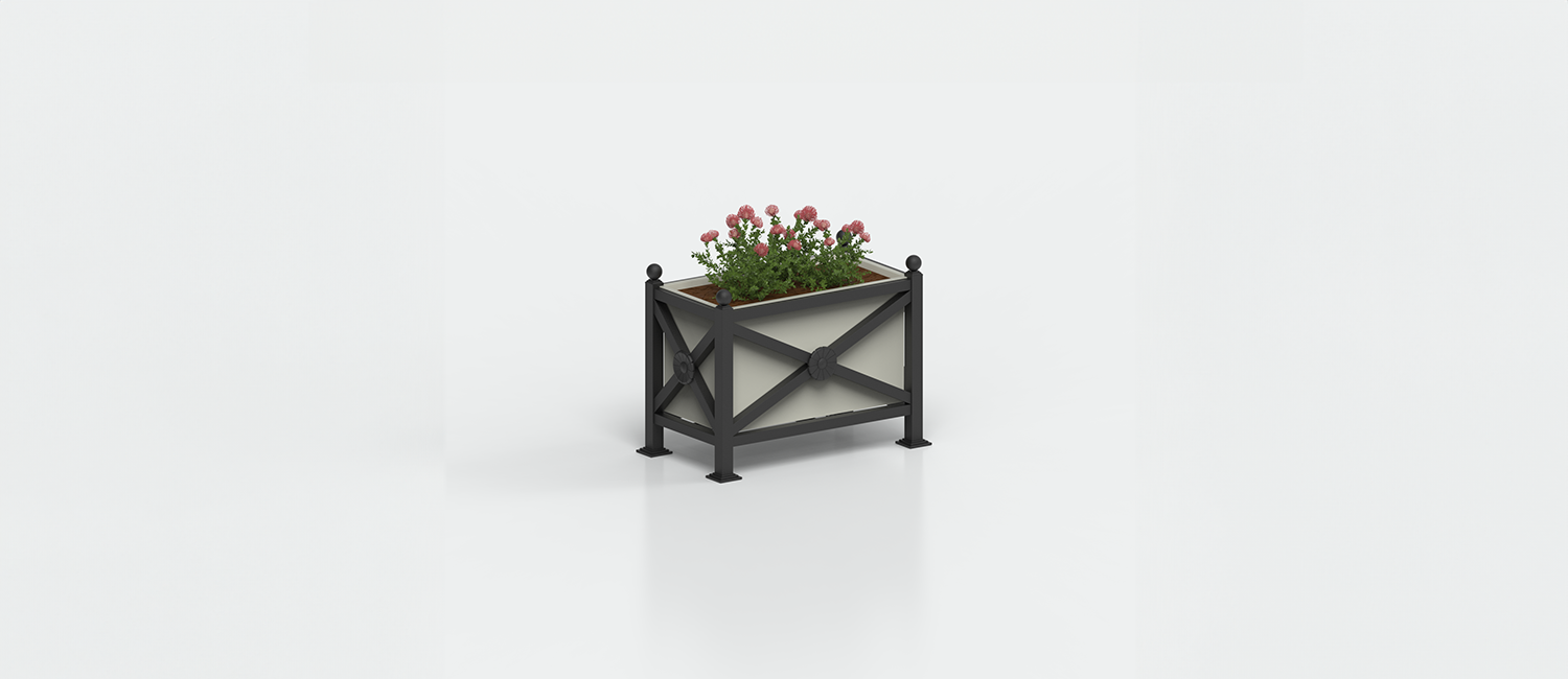 Di forma rettangolare, composta da N. 4 colonnine in tubo quadro di acciaio zincato, con elemento decorativo alla sommità; ogni singola colonnina è provvista di piastra alla base in acciaio zincato. Traverse di collegamento e crociere interne in tubo quadro di acciaio zincato; le crociere sono adornate all'esterno da elemento decorativo centrale. Vasca interna realizzata in lamiera zincata.